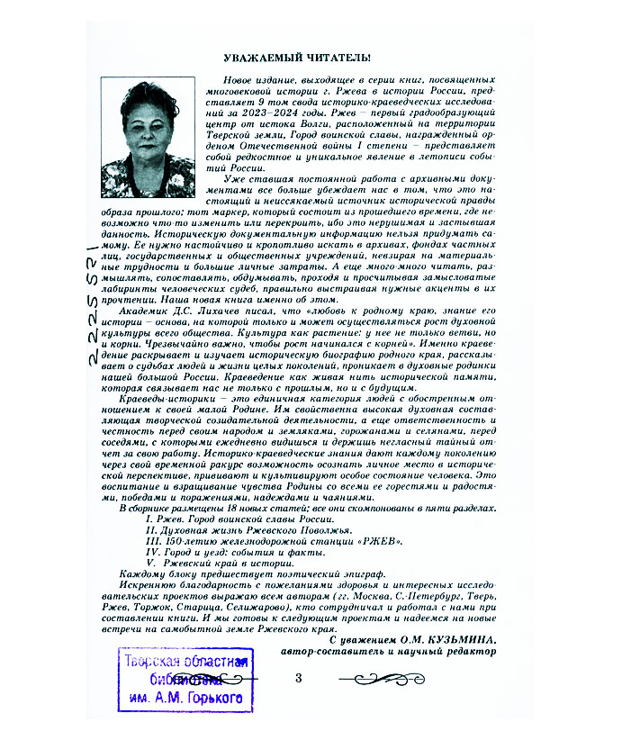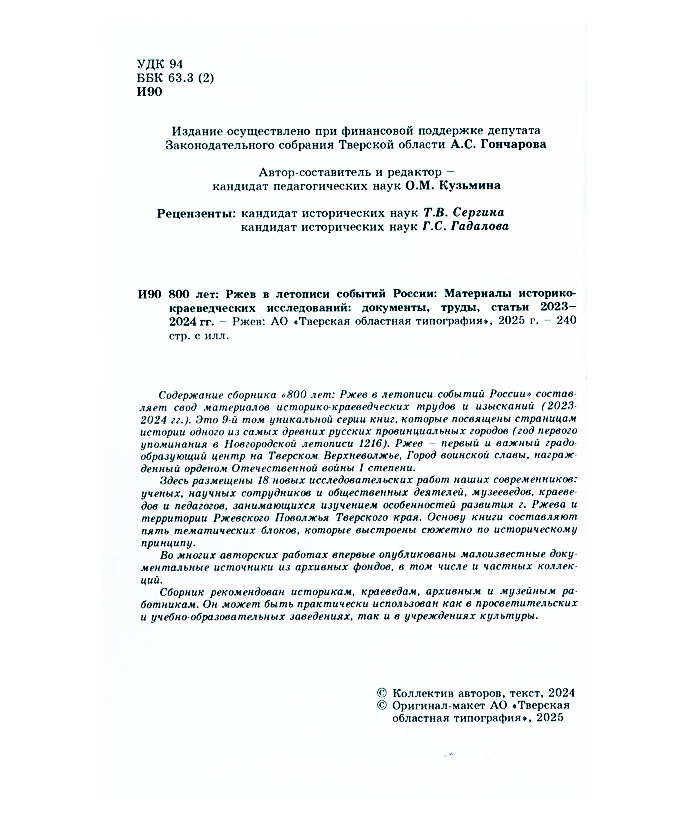 800 лет: Ржев в летописи событий России : материалы историко-краевед. исслед.: док., тр., ст. 2023-2024 гг. / Адм. Ржев. муницип. округа Твер. обл., Упр. культуры, Ржев. краевед. о-во, Ржев. отд-ние Твер. регион. обществ. орг. Рос. о-ва «Знание» ; авт.-сост. и ред. О.М. Кузьмина ; рецензенты: Т.В. Сергина, Г.С. Гадалова. - Ржев ; Тверь : Твер. обл. тип., 2025. - 239 с. : ил., портр., факс.