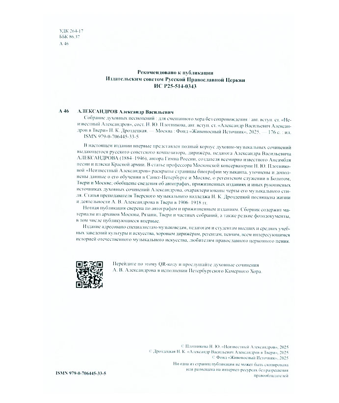 Александров А.В. Собрание духовных песнопений : для смеш. хора без сопровожд. / Александр Васильевич Александров ; сост. Н.Ю. Плотникова ; авт. вступ. ст. Н.К. Дроздецкая. – Москва : Фонд «Живоносный Источник», 2025. – 176 с.: ил.