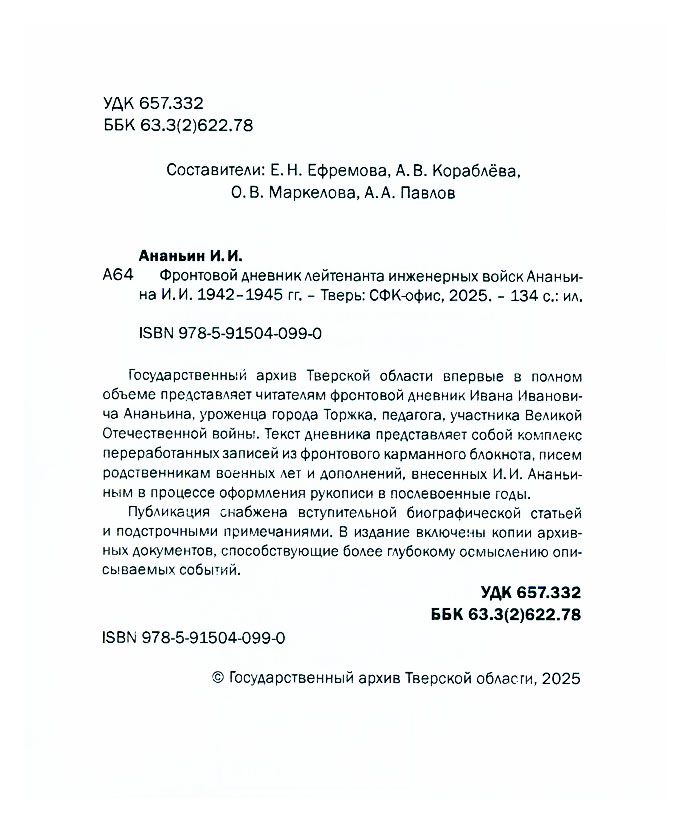 Фронтовой дневник лейтенанта инженерных войск Ананьина Ивана Ивановича, 1942-1945 гг. / Ананьин И.И.; Гос. архив Тверской обл. ; сост.: Е.Н. Ефремова, А.В. Кораблёва, О.В. Маркелова, А.А. Павлов. - Тверь : СФК-офис, 2025. -133 с. : [10] л. ил., факс.