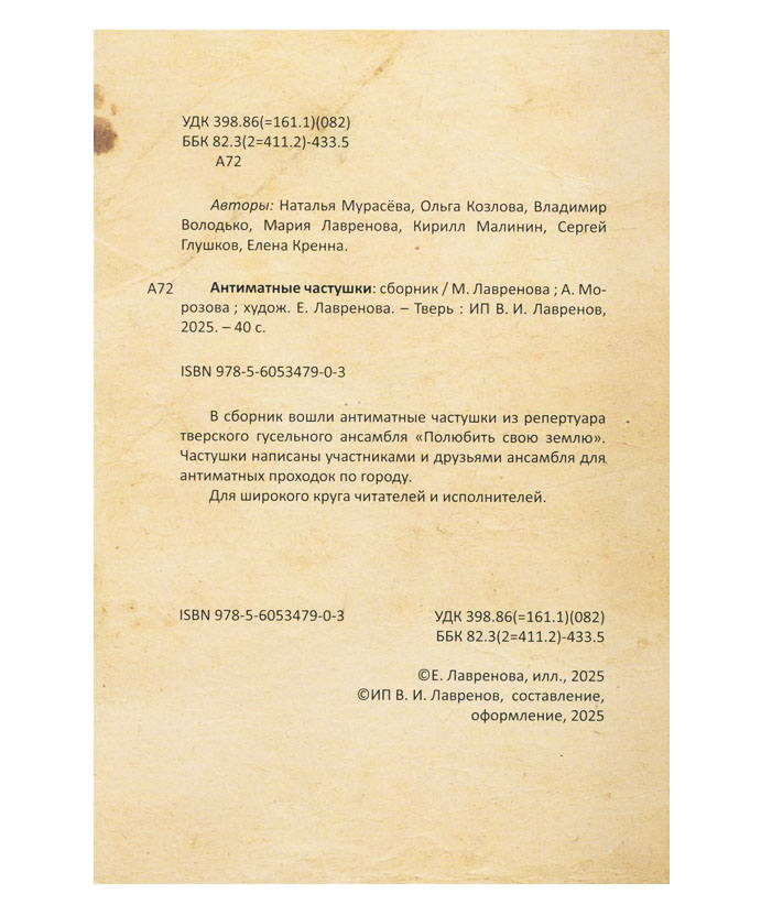 Антиматные частушки : [сб.] / авт. коллектив: Н. Мурасёва [и др.]; сост. М. Лавренова, А. Морозова; худож. Е. Лавренова. - Тверь : ИП В.И. Лавренов, 2025. - 40 с. : цв. ил. Эту книгу вы можете найти в отделах Краеведческий информационный центр 2026 Филологические науки