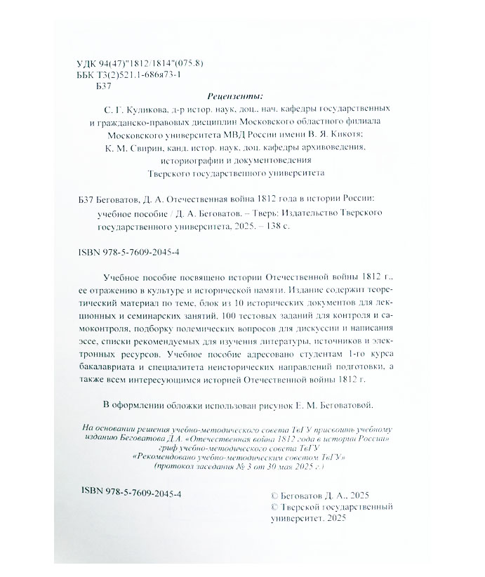 Беговатов Д.А. Отечественная война 1812 года в истории России : учеб. пособие. – Тверь : Твер. гос. ун-т, 2025. – 138 с. Эту книгу вы можете найти в отделах Краеведческий информационный центр 2026 История
