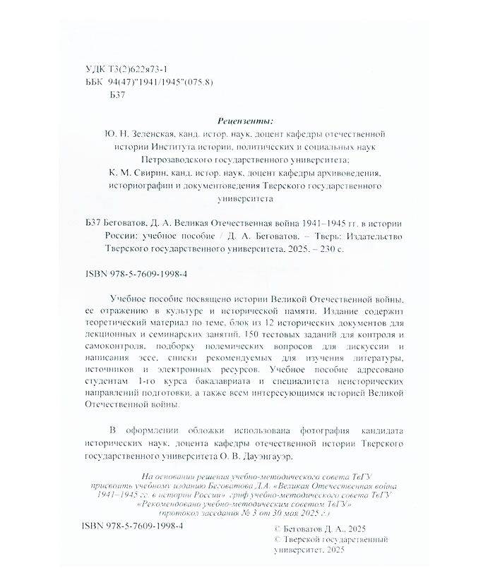 Беговатов Д.А. Великая Отечественная война 1941–1945 гг. в истории России : учеб. пособие для студентов 1-го курса бакалавриата и специалитета неист. направлений подгот. / Дмитрий Александрович Беговатов ; М-во науки и высш. образования РФ, Твер. гос. ун-т, Ист. фак., Каф. отеч. истории. - Тверь : ТвГУ, 2025. – 230 с.