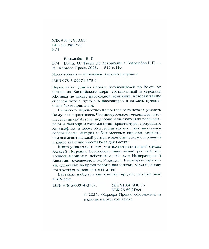 Боголюбов Н.П. (1820-1898) Волга от Твери до Астрахани / Николай Петрович Боголюбов ; ил.: Алексей Петрович Боголюбов. - Москва : Карьера Пресс, 2025. - 477, [2] c., [10] л. пл., к. : ил. Эту книгу вы можете найти в отделах Краеведческий информационный центр 2026 История