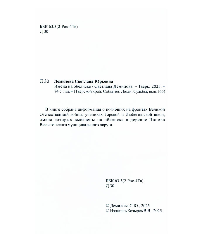 Демидова С.Ю. Имена на обелиске / Светлана Юрьевна Демидова; Муниципальное учреждение культуры «Весьегонская централизованная библиотечная система». - Тверь : Издатель Козырев В.В., 2025. - 73 с. : портр. - (Тверской край : события. Люди. Судьбы : краевед. альм. / ред.: В. В. Козырев; вып. 165).