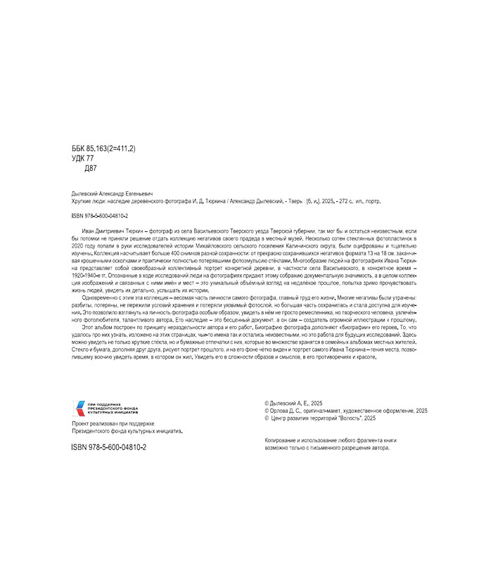 Дылевский А.Е. Хрупкие люди: наследие деревенского фотографа И.Д. Тюркина / Александр Евгеньевич Дылевский ; Центр развития территорий «Волость» . - Тверь : Тверская фабрика печати, 2025. – 272 с. : фот. ; 25*30 см. - (При поддержке Президентского фонда культурных инициатив).