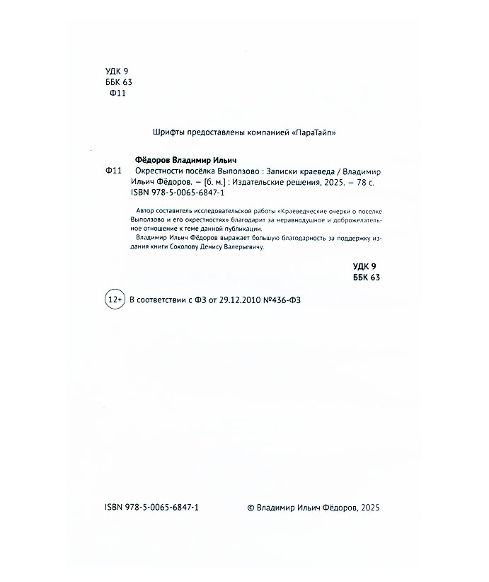 Фёдоров В.И. Окрестности посёлка Выползово : записки краеведа / Владимир Ильич Фёдоров. - [Б. м.] : Издательские решения, 2025. - 76, [1] с. : ил., портр. Эту книгу вы можете найти в отделах Краеведческий информационный центр 2026 История