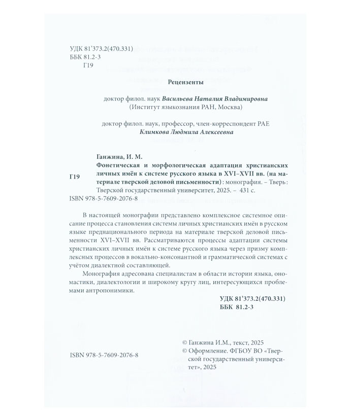 Ганжина И.М. Фонетическая и морфологическая адаптация христианских личных имен к системе русского языка в XVI-XVII вв. (на материале тверской деловой письменности) : монография / Ирина Михайловна Ганжина ; М-во науки и высш. образования РФ, Федерал. гос. бюджет. образоват. учреждение высш. образования «Тверской государственный университет». - Тверь : ТвГУ, 2025. - 431 с. : табл.