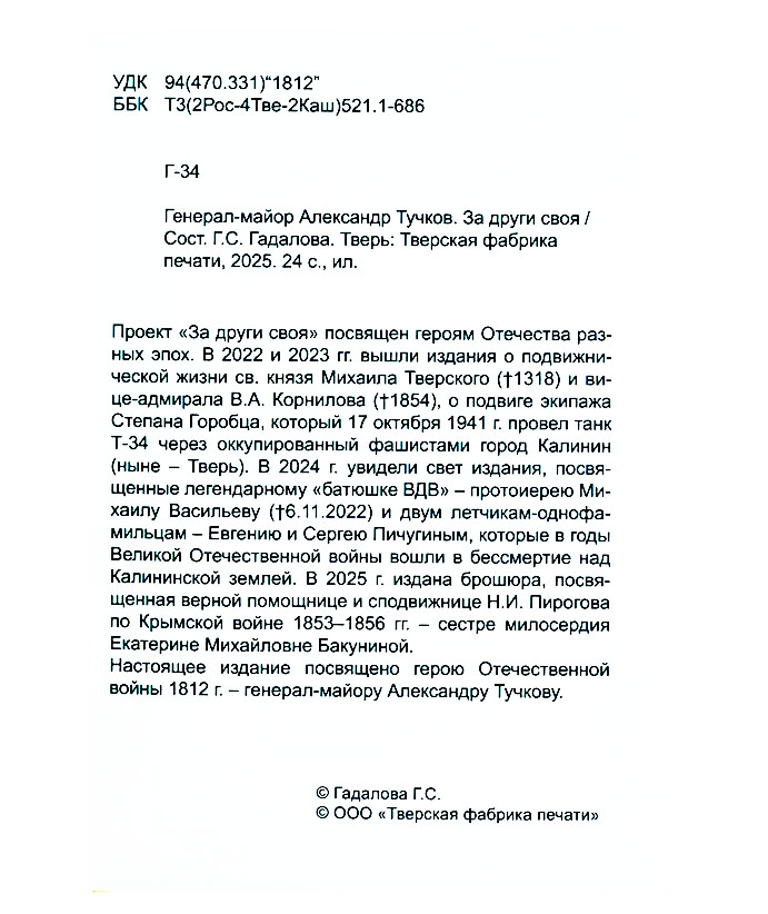 Генерал-майор Александр Тучков. За други своя / сост.: Г.С. Гадалова ; авт. идеи: Г.С. Гадалова. - Тверь : Твер. ф-ка печати, 2025. - 24 с. : ил., цв. ил.,портр., к. - (За други своя). Эту книгу вы можете найти в отделах Краеведческий информационный центр 2026 История