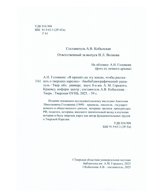 А.Н. Головкин: «Я пришёл на эту землю, чтобы рассказать о тверских Карелах» : биобиблиогр. указ. / Твер. обл. универс. науч. б-ка им. А.М. Горького, Краевед. информ. центр ; сост.: А.В. Кобызская. - Тверь : Твер. обл. универс. науч. б-ка им. А.М. Горького, 2025. - 58 с.