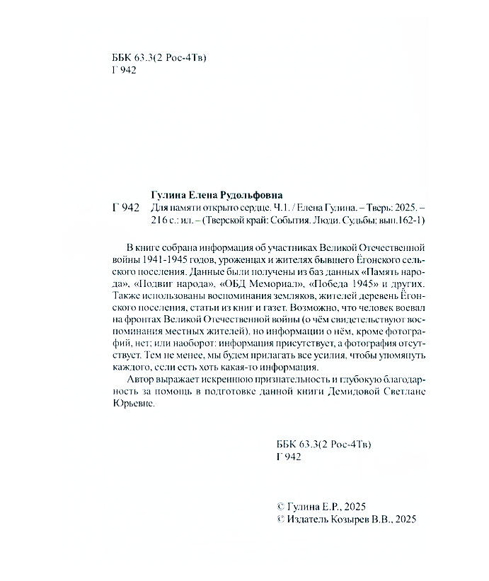 Гулина Е. Р. Для памяти открыто сердце / Елена Гулина ; Муниципальное учреждение культуры «Весьегонская централизованная библиотечная система», Большеовсяниковская библиотека. - Тверь : Издатель Козырев В.В., 2025. - (Тверской край : события. Люди. Судьбы : краеведческий альманах / редактор: В. В. Козырев ; ...) (80 Победа!)
