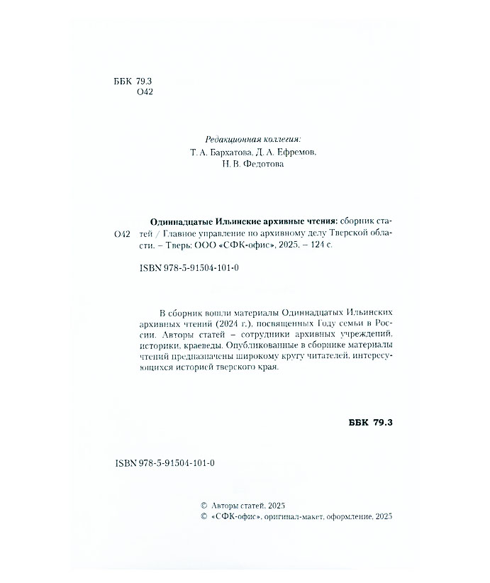 Ильинские архивные чтения, 11 : сб. статей / Гл. упр. по архивному делу Твер. обл.; ред. кол.: Т.А. Бархатова, Д.А. Ефремов, Н.В. Федотова. - Тверь : СФК-офис, 2025. - 123 с., [8] л. ил., портр., факс. You must have JavaScript enabled to use this form. Эту книгу вы можете найти в отделах Краеведческий информационный центр 2026 Наука. Культура. Искусство