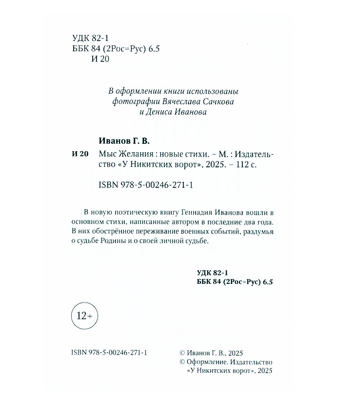 Иванов Г.В. Мыс желания : новые стихи / Геннадий Викторович Иванов. - Москва : У Никитских ворот, 2025. - 107, [4] с. : портр. Эту книгу вы можете найти в отделах Краеведческий информационный центр 2026 Художественная литература. Детская литература