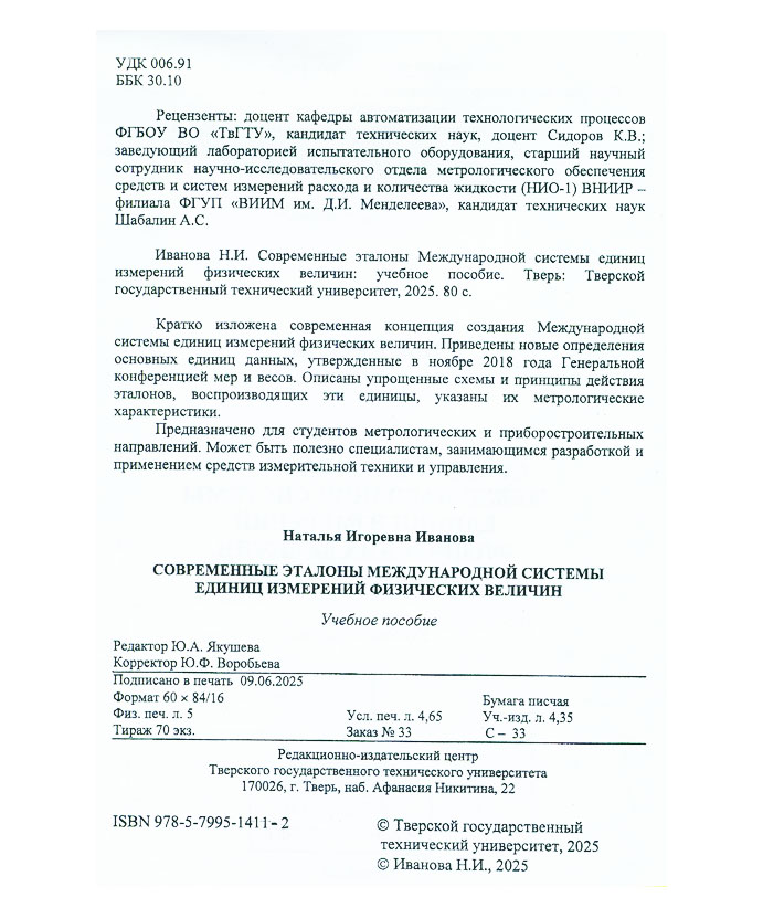 Иванова Н.И. Современные эталоны международной системы единиц измерений физических величин : учеб. пособие / Наталья Игоревна Иванова ; Минобрнауки России, Твер. гос. техн. ун-т. - Тверь : ТГТУ, 2025. - 80 с. : граф., схем.