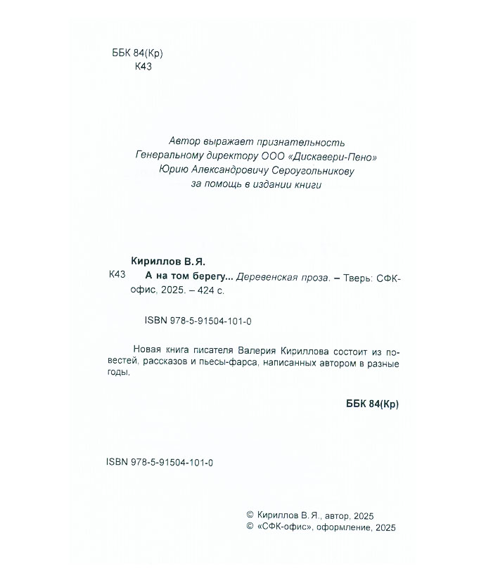 Кириллов В.Я. А на том берегу… : деревенская проза. – Тверь : СФК-офис, 2025. – 424 с. You must have JavaScript enabled to use this form. Эту книгу вы можете найти в отделах Краеведческий информационный центр 2026 Художественная литература. Детская литература