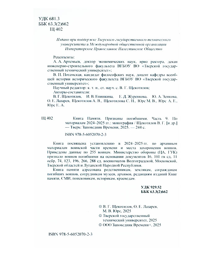 Книга Памяти. Признаны погибшими. Ч. 9: По материалам 2024-2025 гг. : монография / авт.-сост. В.Г. Щекотилов, И.В. Епишкина, Е.Д. Журенкова [и др.]. - Тверь : Заповедник Времени, 2025. - 243 с. : фот., карт. Эту книгу вы можете найти в отделах Краеведческий информационный центр 2026 История