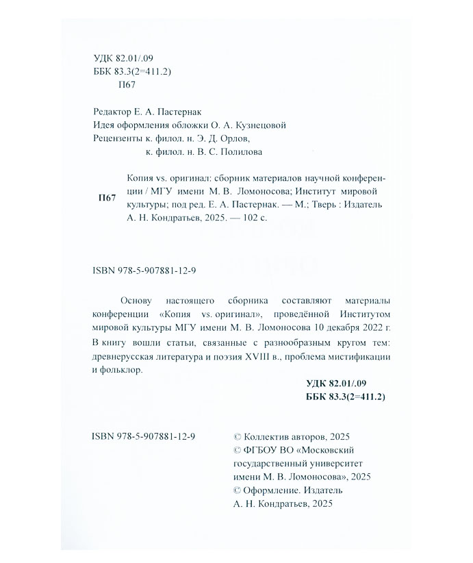 Копия vs. оригинал : сб. материалов науч. конф., [10 дек. 2022 г.] / Моск. гос. ун-т им. М.В. Ломоносова, Ин-т мировой культуры ; под ред. Е.А. Пастернак. – Москва ; Тверь : Издатель А.Н. Кондратьев, 2025. – 102 с.