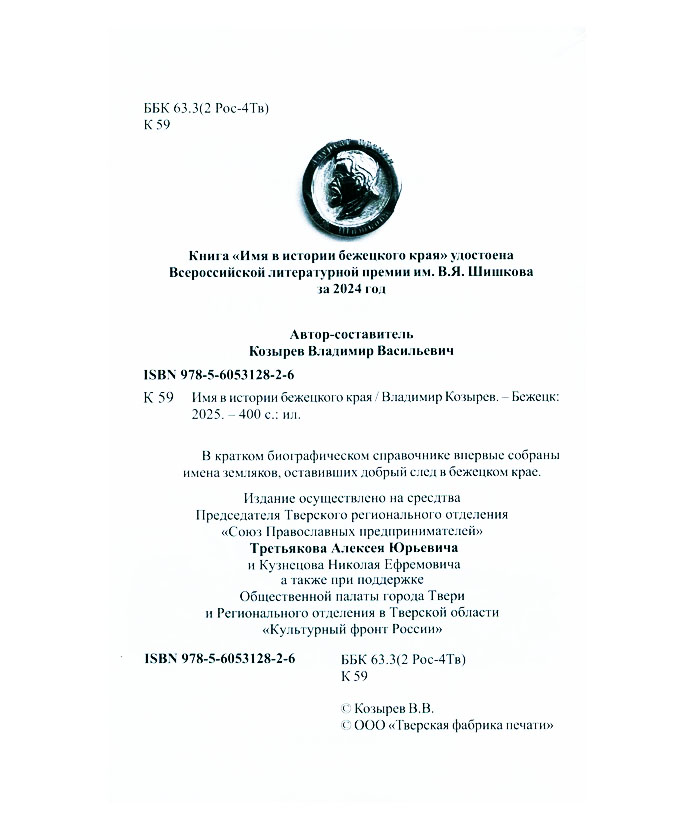 Козырев В.В. Имя в истории бежецкого края : крат. биогр. справ. / Владимир Васильевич Козырев. - Бежецк : Издатель В. В. Козырев, 2025. - 400 с. : ил., портр., факс. Эту книгу вы можете найти в отделах Краеведческий информационный центр 2026 История