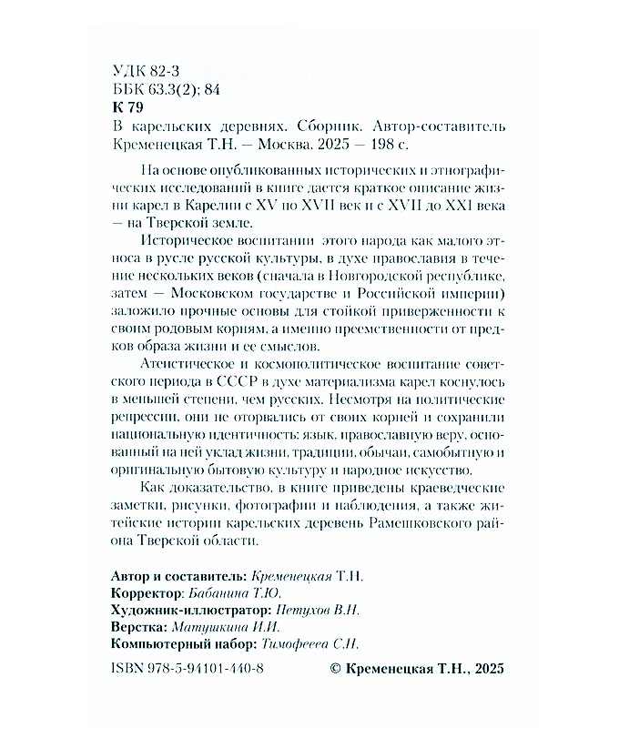 Кременецкая Т.Н. В карельских деревнях : сборник / Таисия Николаевна Кременецкая. ¬– Москва : [б. и.], 2025. – 198 с. Эту книгу вы можете найти в отделах Краеведческий информационный центр 2026 История