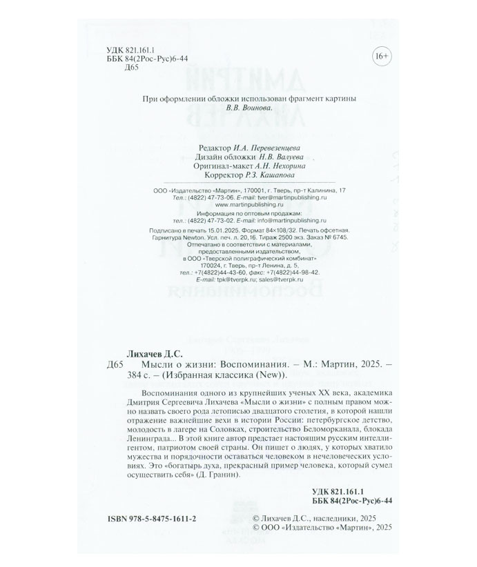 Лихачев Д.С. Мысли о жизни : воспоминания / Дмитрий Сергеевич Лихачев. – Москва ; [Тверь] : Мартин, 2025.–- 384 с. : фот. – (Избранная классика. [New]). You must have JavaScript enabled to use this form. Эту книгу вы можете найти в отделах Отдел обслуживания пользователей и хранения основного фонда 2026 Философия. Психология. Религия