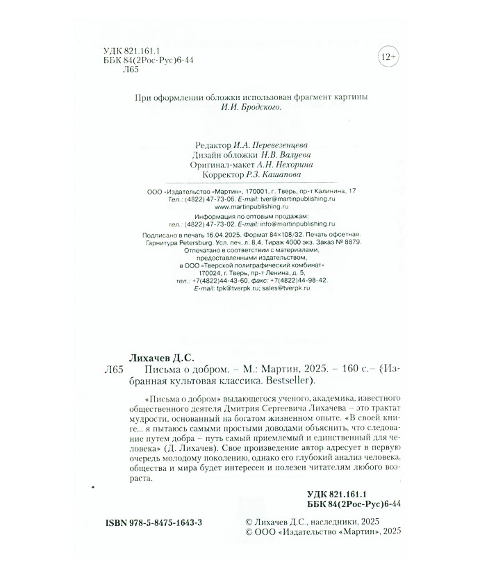 Лихачев Д.С. Письма о добром / Дмитрий Сергеевич Лихачев. - Москва ; [Тверь] : Мартин, 2025. - 159, [1] с. : портр. - (Избранная культовая классика. Bestseller). You must have JavaScript enabled to use this form. Эту книгу вы можете найти в отделах Отдел обслуживания пользователей и хранения основного фонда 2026 Философия. Психология. Религия