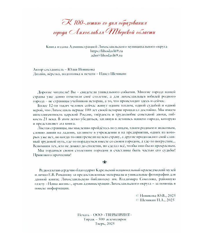 Лихославль: летопись столетнего города / Адм. Лихославл. муницип. округа ; авт.-сост. Ю.В. Новикова ; авт. предисл. Н.Н. Виноградова. - Тверь : ТВЕРЬПРИНТ, 2025. - 104 с. : ил. Эту книгу вы можете найти в отделах Краеведческий информационный центр 2026 История