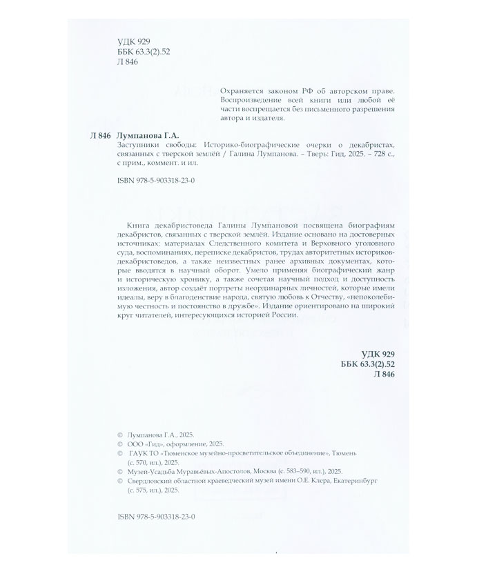 Лумпанова Г.А. Заступники свободы : историко-биогр. очерки о декабристах, связанных с тверской землей / Галина Алексеевна Лумпанова. - Тверь : Гид, 2025. – 727 с.: ил., портр., факс. You must have JavaScript enabled to use this form. Эту книгу вы можете найти в отделах Краеведческий информационный центр 2026 История