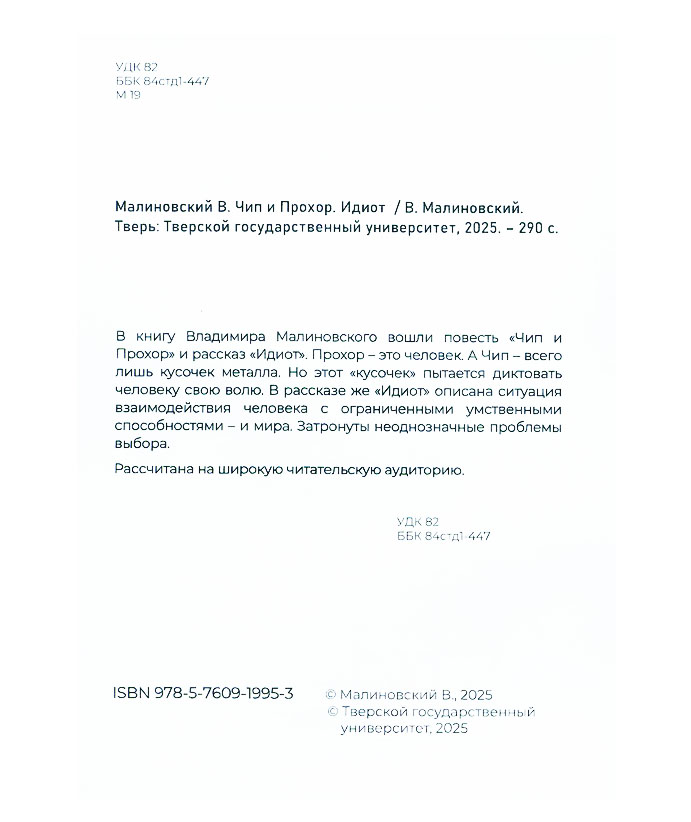 Малиновский В.Е. Чип и Прохор ; Идиот / Владимир Евгеньевич Малиновский. - Тверь : ТвГУ, 2025. - 66 с. Эту книгу вы можете найти в отделах Краеведческий информационный центр 2026 Художественная литература. Детская литература