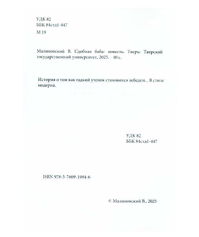 Малиновский В.Е. Сдобная баба : повесть / Владимир Евгеньевич Малиновский. - Тверь : ТвГУ, 2025. - 39, [1] с. Эту книгу вы можете найти в отделах Краеведческий информационный центр 2026 Художественная литература. Детская литература
