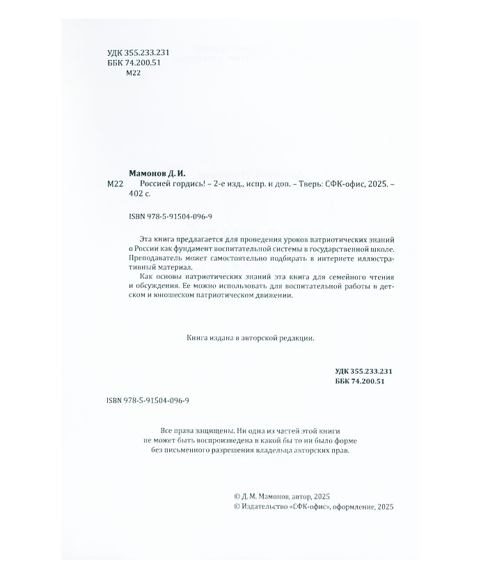 Мамонов Д.И. Россией гордись! / Дмитрий Иванович Мамонов ; Союз православ. педагогов за нравств. спасение детей России. - 2-е изд., испр. и доп. - Тверь : СФК-офис, 2025. - 401 с. You must have JavaScript enabled to use this form. Эту книгу вы можете найти в отделах Краеведческий информационный центр 2026 Наука. Культура. Искусство