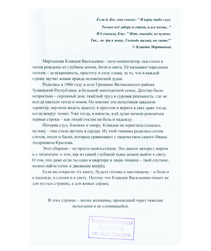 Мартынова К.В. Ты гори, моя звезда! : песни, басни, стихи / Клавдия Васильевна Мартынова. - Тверь : [б. и.], 2025. - 229 с. : цв. ил. You must have JavaScript enabled to use this form. Эту книгу вы можете найти в отделах Краеведческий информационный центр 2026 Художественная литература. Детская литература