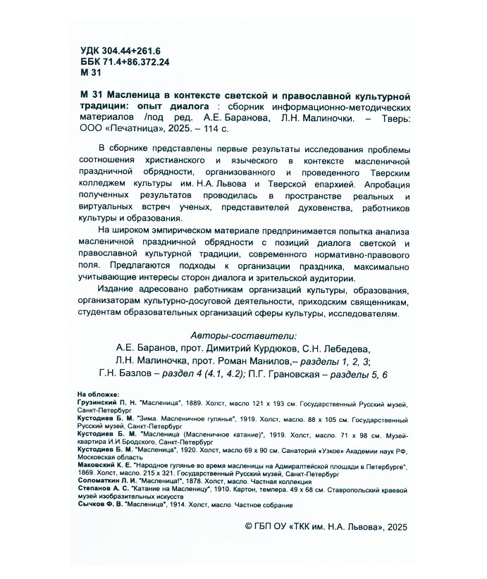 Масленица в контексте светской и православной культурной традиции: опыт диалога : сб. информ.-метод. материалов / М-во культуры Твер. обл., Твер. колледж культуры им. Н.А. Львова ; авт.-сост.: А.Е. Баранов [и др.] ; ред. А.Е. Баранов, Л.Н. Малиночка. - Тверь : Печатница, 2025. - 114 с.