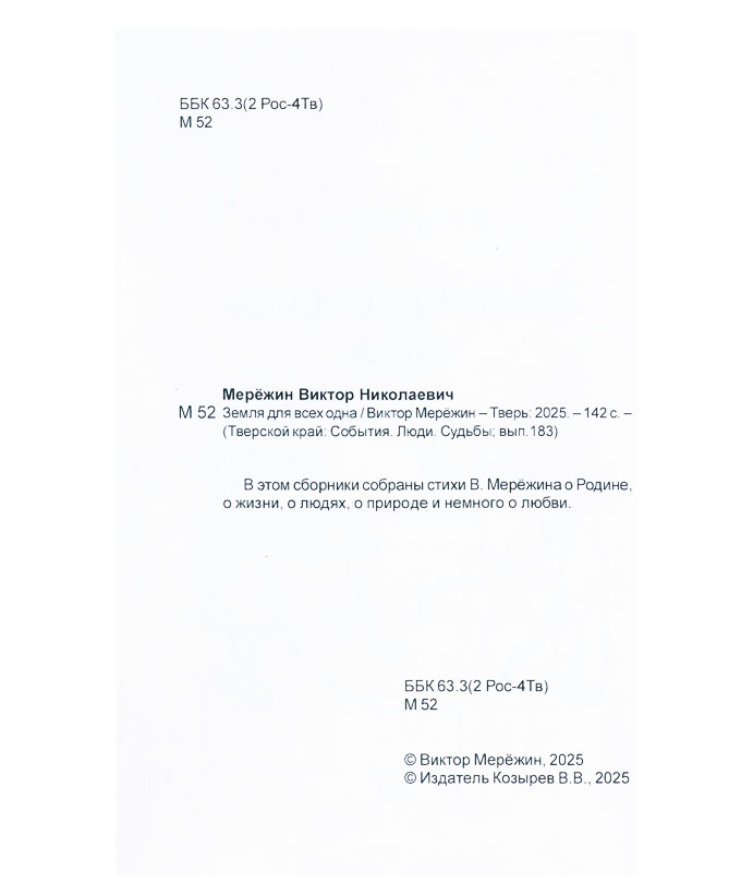 Мерёжин В.Н. Земля для всех одна : [стихотворения] / Виктор Николаевич Мерёжин ; ред. В.В. Козырев. - Тверь : [б. и.], 2025. - 141 с. - (Тверской край: События. Люди. Судьбы ; вып. 183). You must have JavaScript enabled to use this form. Эту книгу вы можете найти в отделах Краеведческий информационный центр 2026 Художественная литература. Детская литература