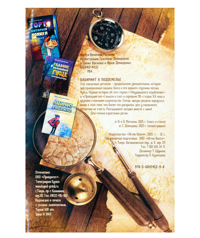 Метлина Н.О. Лабиринт в подземелье : сказочный детектив / Нина Олеговна Метлина, В.Н. Метлин ; худож. С. Демидова. - Тверь : Исток Волги : Приоритет, 2025. - 32 с. : цв. ил. You must have JavaScript enabled to use this form. Эту книгу вы можете найти в отделах Краеведческий информационный центр 2026 Художественная литература. Детская литература