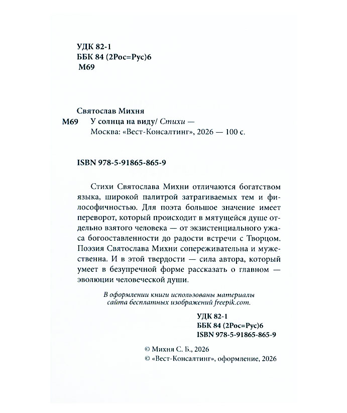 Михня С. У солнца на виду : стихи / Святослав Михня. – Москва : Вест-Консалтинг, 2026. – 100 с. You must have JavaScript enabled to use this form. Эту книгу вы можете найти в отделах Краеведческий информационный центр 2026 Художественная литература. Детская литература