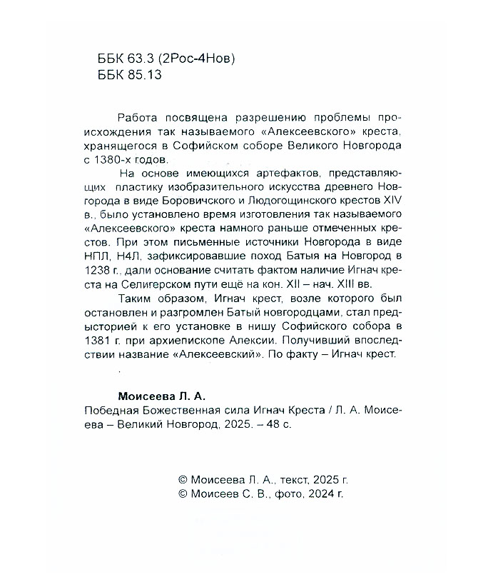 Моисеева Л.А. Победная Божественная сила Игнач Креста (так называемого «Алексеевского») против Батыя на р. Полымять в 1238 г. / Лидия Алексеевна Моисеева. - Великий Новгород : [б. и.], 2025. - 45, [2] с.: цв. ил. Эту книгу вы можете найти в отделах Краеведческий информационный центр 2026 История