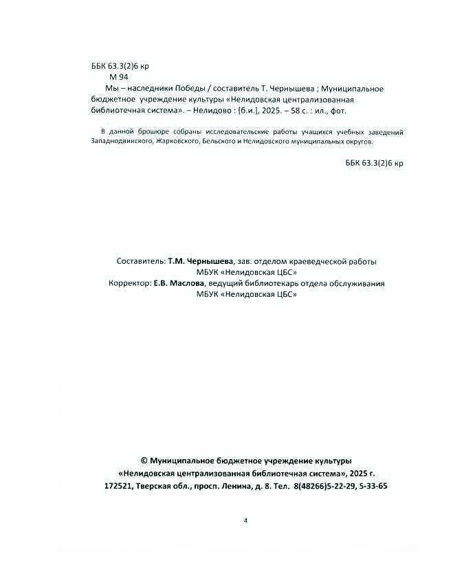 Мы - наследники Победы : сб. исслед. работ участников Межмуницип. Молодеж. слёта, посвящ. 80-летию Победы в Великой Отечественной войне (1941-1945) / Нелидов. централиз. библ. система, Отд. краевед. работы ; сост. Т.М. Чернышева. - Нелидово : [б. и.], 2025. - 58 с. : ил., факс.