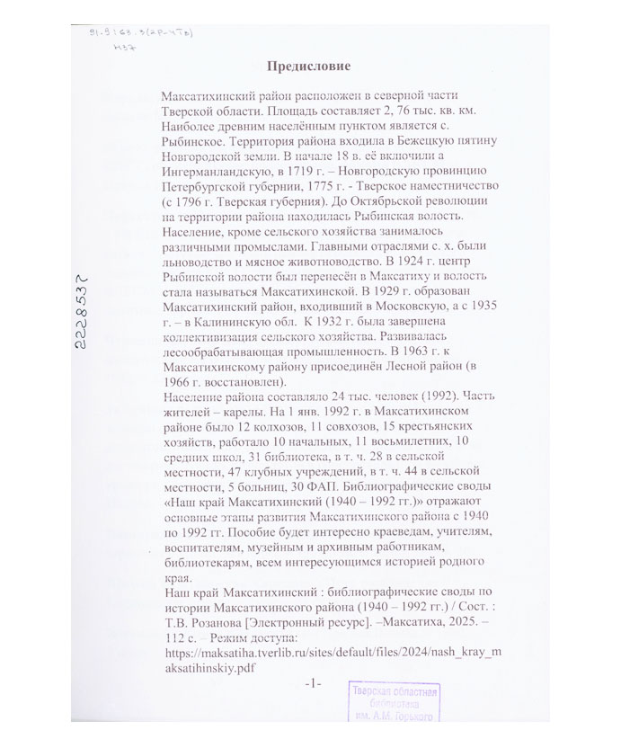 Наш край Максатихинский (1940-1992 гг.) : библиографические своды по истории Максатихинского района / Максатихин. централиз. биб. система; сост. Т.В. Розанова. - Максатиха : [б. и.], 2025. - 112 с. Эту книгу вы можете найти в отделах Краеведческий информационный центр 2026 История