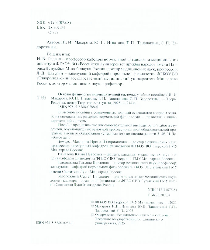 Основы физиологии пищеварительной системы : учеб. пособие / авт.: И.И. Макарова, Ю.П. Игнатова, Т.П. Тананакина, С.П. Задорожный; М-во здравоохранения РФ, Твер. гос. мед. ун-т, Луганский гос. мед. ун-т. - Тверь : РИЦ ТвГМУ, 2025. - 218 с. : ил., цв. ил.