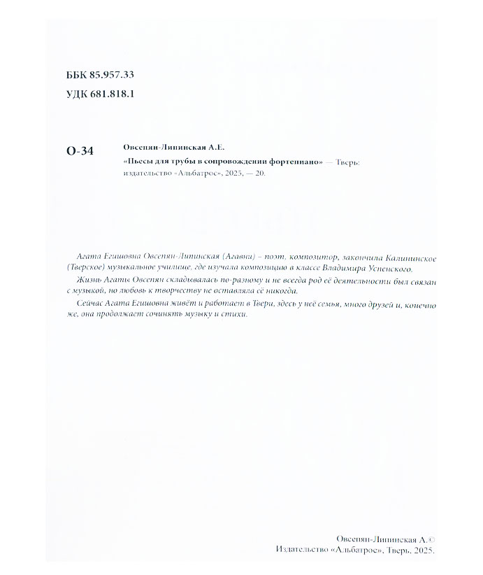 Овсепян-Липинская А.Е. Пьесы для трубы в сопровождении фортепиано / Агата Егишовна Овсепян-Липинская (Агавни). – Тверь : Альбатрос, 2025. – 20 с. You must have JavaScript enabled to use this form. Эту книгу вы можете найти в отделах Зал нотно-музыкальной литературы 2026 Наука. Культура. Искусство