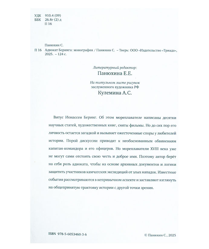 Панюхин С. Адвокат Беринга : монография / Сергей Панюхин. - Тверь : Триада, 2025. - 124 с. : ил., портр., факс., табл. You must have JavaScript enabled to use this form. Эту книгу вы можете найти в отделах Отдел обслуживания пользователей и хранения основного фонда Абонемент 2026 Естественные науки
