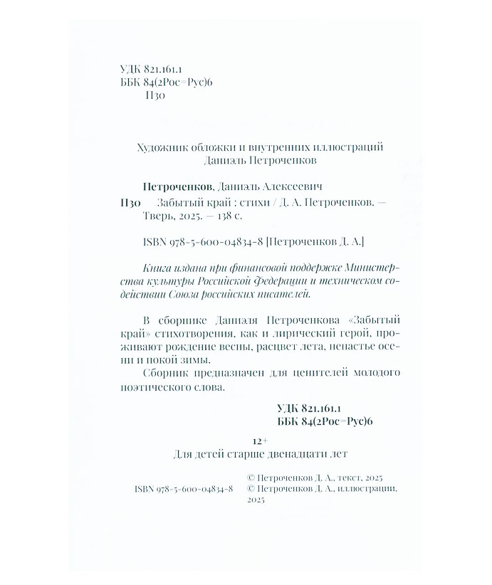 Петроченков Д.А. Забытый край : стихи / Даниэль Алексеевич Петроченков. – Тверь : [б. и.], 2025. – 138 с. You must have JavaScript enabled to use this form. Эту книгу вы можете найти в отделах Краеведческий информационный центр 2026 Художественная литература. Детская литература