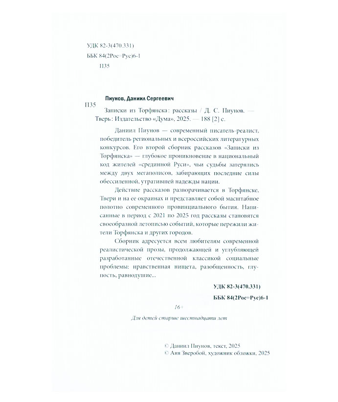 Пиунов Д.С. Записки из Торфянска : рассказы / Даниил Сергеевич Пиунов. - Тверь : Дума, 2025. - 188 с. You must have JavaScript enabled to use this form. Эту книгу вы можете найти в отделах Краеведческий информационный центр 2026 Художественная литература. Детская литература