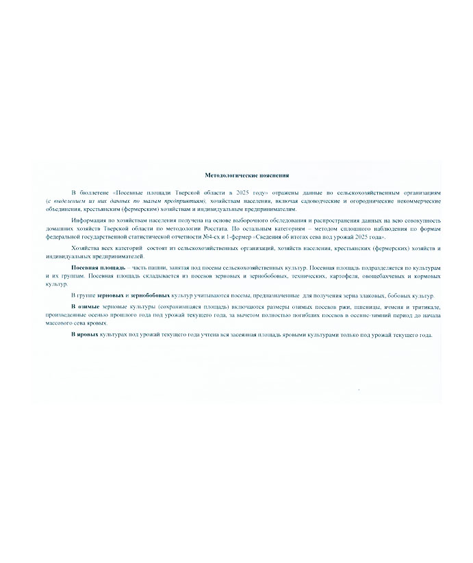 Посевные площади Тверской области в 2025 году (весеннего учета) : [стат. сб.] / Федер. служба гос. статистики, Террит. орган Федер. сужбы гос. статистики по Твер. обл. (Тверьстат) ; ред. Т.В. Смирнова. - Тверь : Тверьстат, 2025. - 34 с. : табл.
