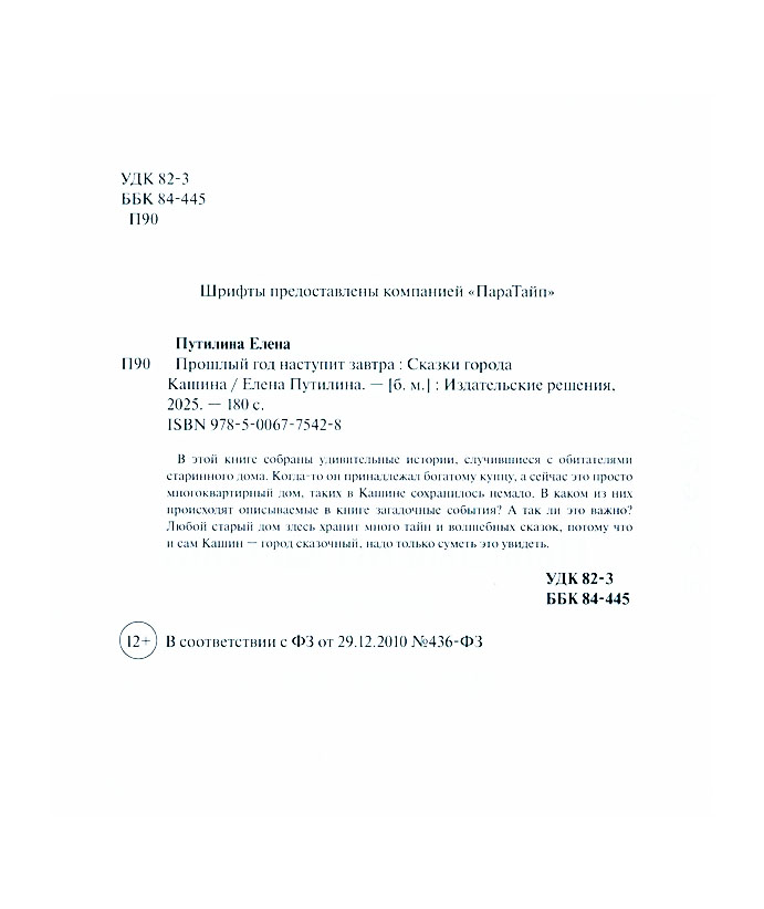 Путилина Е.Н. Прошлый год наступит завтра. Сказки города Кашина / Елена Николаевна Путилина. - [Б. м.] : Издательские решения, 2025. - 178, [1] с. You must have JavaScript enabled to use this form. Эту книгу вы можете найти в отделах Краеведческий информационный центр 2026 Художественная литература. Детская литература