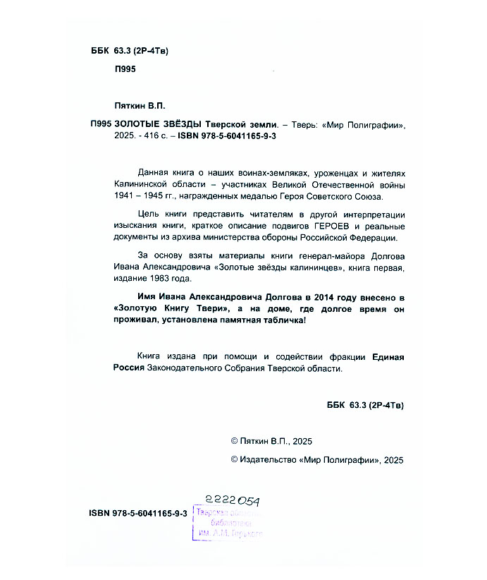 Пяткин В.П. Золотые звезды Тверской земли / Владимир Петрович Пяткин. - Тверь : Мир Полиграфии, 2025. - 415 с. : ил., портр., факс. Эту книгу вы можете найти в отделах Краеведческий информационный центр 2026 История