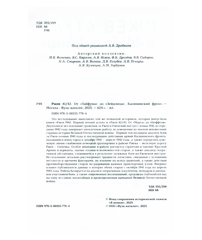 Ржев 41/42. От «Тайфуна» до «Зейдлица». Калининский фронт / авт. коллектив: М.В. Фоменко, В.С. Карасев, А.В. Исаев [и др.] ; под общ. ред. А. В. Драбкина ; Музей Победы, Президент. фонд культур. инициатив, Фонд сохранения ист. памяти «Я помню». - Москва : Яуза-каталог, 2025. - 618, [1] с., [20] вкл. л. цв. карт. : портр., табл., ил.