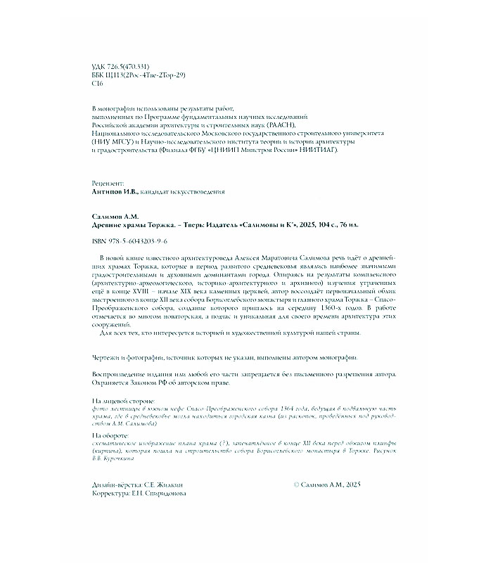 Салимов А.М. Древние храмы Торжка / Алексей Маратович Салимов. - Тверь : Салимовы и К°, 2025. - 103 с. : ил., к., пл., портр. You must have JavaScript enabled to use this form. Эту книгу вы можете найти в отделах Краеведческий информационный центр Читальный зал литературы по искусству 2026 Наука. Культура. Искусство