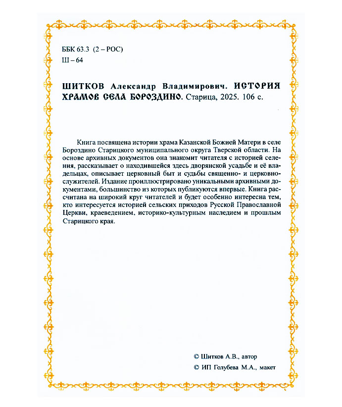 Шитков А.В. История храмов села Бороздино / Александр Владимирович Шитков. - Старица : ИП Голубева М.А. : ПЦ «СМУК», 2025. - 104 с. : ил. You must have JavaScript enabled to use this form. Эту книгу вы можете найти в отделах Краеведческий информационный центр 2026 Философия. Психология. Религия