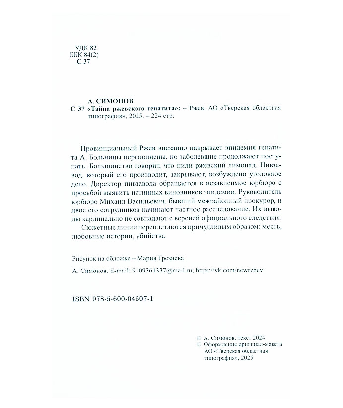 Симонов А.Д. Тайна ржевского гепатита : детектив / Андрей Дмитриевич Симонов. - Ржев ; [Тверь] : Твер. обл. тип., 2025. - 221, [1] с. You must have JavaScript enabled to use this form. Эту книгу вы можете найти в отделах Краеведческий информационный центр 2026 Художественная литература. Детская литература