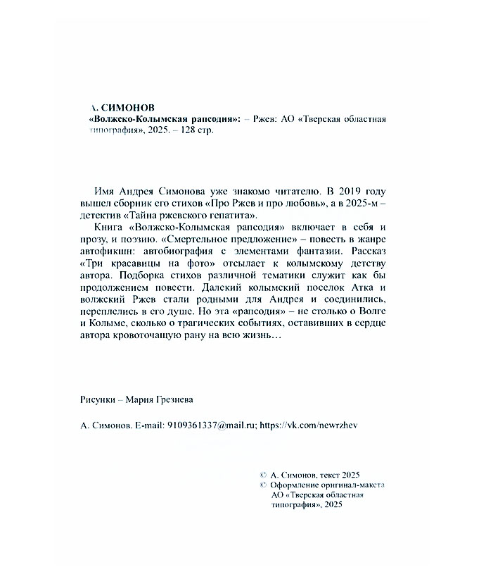 Симонов А.Д. Волжско-Колымская рапсодия /Андрей Дмитриевич Симонов; рисунки: Мария Грезнева. - Ржев ; [Тверь] : Твер. обл. тип., 2025. - 127,[1] с.: ил. You must have JavaScript enabled to use this form. Эту книгу вы можете найти в отделах Абонемент Краеведческий информационный центр 2026 Художественная литература. Детская литература